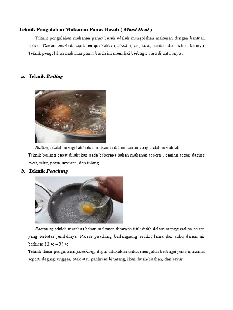 Contoh masakan poaching teknik memasak poaching adalah salah satu teknik yang menggunakan air atau media cair lainnya (susu, bir, kaldu, dll) dengan bantuan panas api yang kecil. Contoh masakan dengan metode simmering adalah simering soup. Metode ini digunakan agar makanan tidak rusak strukturnya. Lemak yang tidak dapat dilihat, … Teknik dasar memasak moist heat cooking.